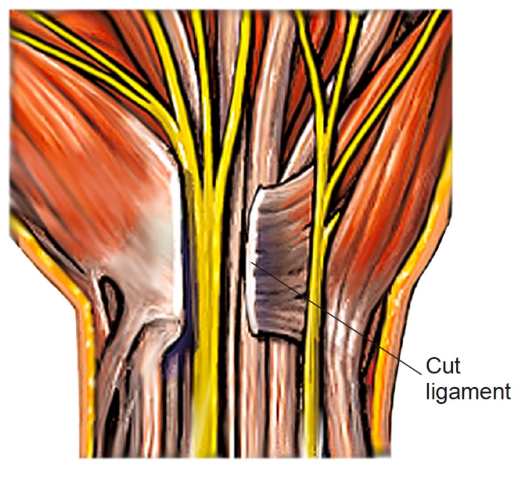 Although surgery is a relatively safe option with excellent 1 year outcomes, there is a price to pay. Since the surgeon divides the ligament at the front of the wrist (flexor retinaculum / transverse carpal ligament), the normal function of this ligament is lost. There are 3 consequences of losing the ligament:
