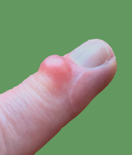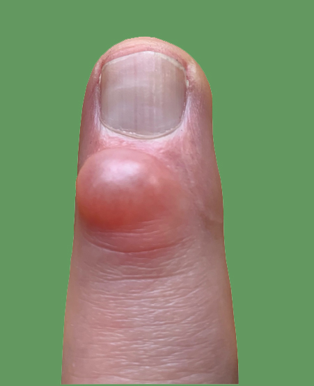 A mucous cyst presents as a small, painless swelling on the back of the finger near the DIP joint. Any finger can be affected. They can vary in size and can cause a “furrow” in the nail due to presence on the underlying nailbed. Most give little in the way of functional problems. Occasionally, the cyst can become very tense due to the build-up of fluid and some tenderness may develop. If they are knocked, some patients find that the cyst may discharge a clear jelly like fluid.