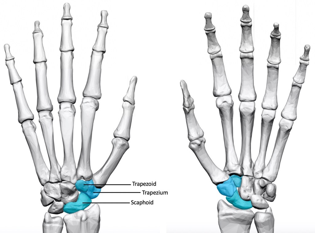 The triscaphoid joint (also known as the STT joint) is located within the wrist joint, and involves the Scaphoid, Trapezium and Trapezoid bones. This joint is important because it provides a strong and stable link between the two rows of bones in the wrist, and transmits force from the thumb across the wrist joint. Arthritis in this joint is relatively uncommon compared to arthritis at the base of the thumb, but affects around 8% of women over the age of 50. The majority of patients with triscaphoid osteoarthritis also have base of thumb arthritis.