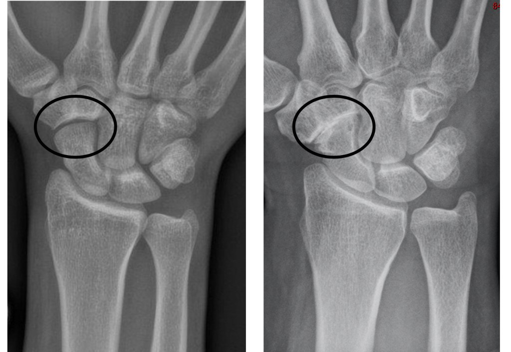 The diagnosis of triscaphoid arthritis is made from the symptoms and signs, and is confirmed on an xray of the wrist. The gap seen on X-rays between bones is not a real gap – it is filled with smooth cartilage (the lining of the joint) in order to allow smooth movement. In arthritis, the cartilage is lost, and therefore the gap between the bones appears diminished.